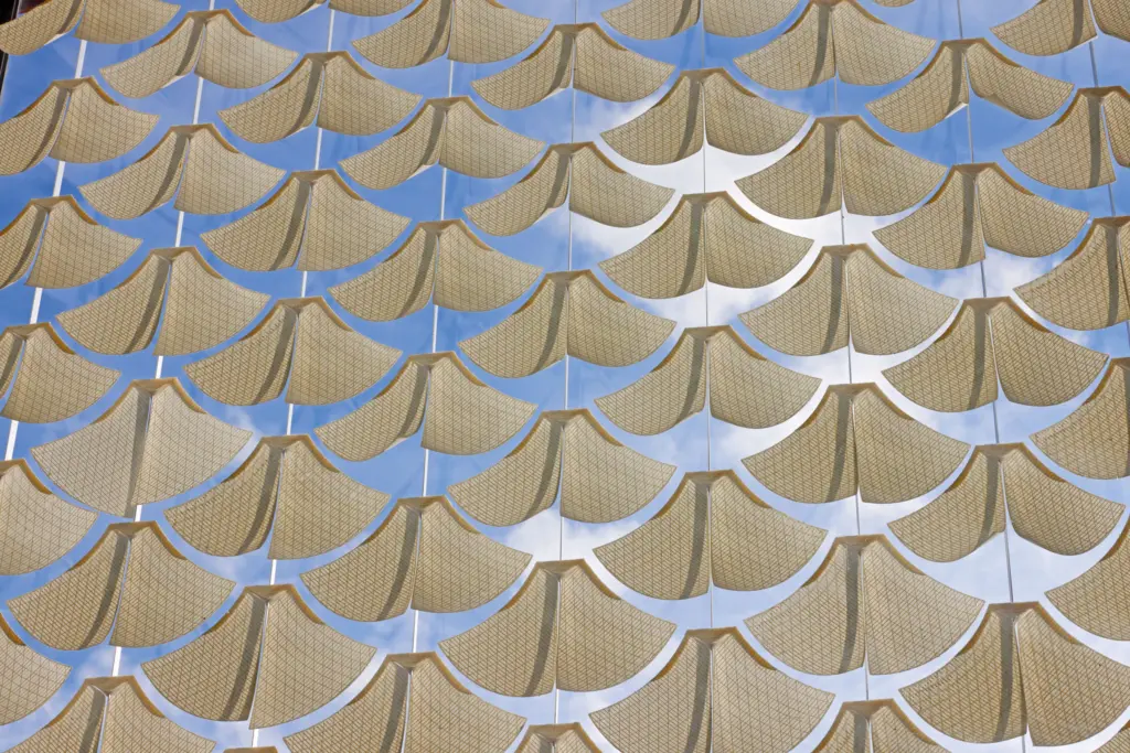 Der Biologe Thomas Speck beschäftigt sich schon seit vielen Jahren mit Bewegungen bei Pflanzen, die unter anderem gewährleisten, dass sich Samen bei der optimalen Witterung effizient verbreiten können. „Uns hat interessiert: Wie macht der Zapfen es, wie öffnet und schließt er sich?“, sagt der Biologie. Die Ergebnisse flossen in eine Art Bauanleitung ein, die dem Stuttgarter Architekten Achim Menges als Vorlage diente für die Entwicklung der gedruckten Verschattungselemente. Nach aufwendigen Designstudien wurden Module aus biobasiertem Polyvinyl und Cellulosefasern entwickelt, die optisch aber wenig gemein haben mit Kiefernzapfen. Denn anders als bei Zapfen ist beim „Solar Gate“ entscheidend, dass die Module bei Sonne eine möglichst große verschattende Fläche bilden, sich aber auch so stark zusammenziehen können, damit etwa die Wintersonne ungestört ins Gebäude scheinen kann oder an bewölkten Tagen genügend Licht ins Gebäude fällt.