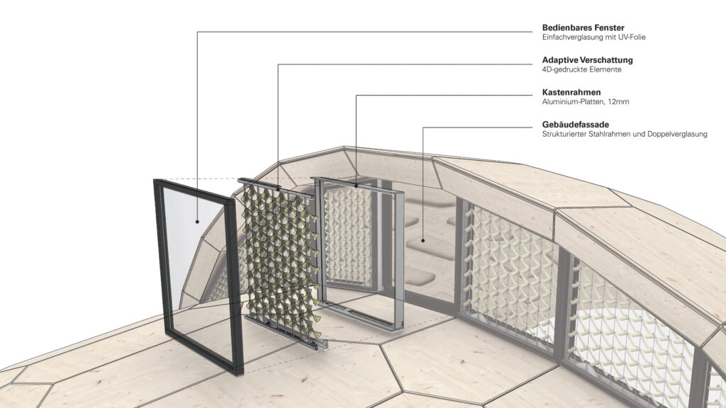 Die Solar-Gate-Module werden im 3D-Druckverfahren hergestellt. Eine neuartige additive Fertigungstechnologie ermöglicht, das Material so zu drucken, dass es auf Umweltreize reagiert und sich selbsttätig in die programmierte Form krümmt. Letztlich handelt es sich also um einen 4D-Druck, weil die vierte Dimension mit ins Spiel kommt: die Zeit.Durch die computerbasierte Fertigung lässt sich die Reaktionsfähigkeit des Materials präzise bestimmen und optimal für die Anwendung an Gebäuden anpassen. So wird sichergestellt, dass sich das Verschattungssystem verlässlich bei heißen, trockenen Bedingungen schließt und bei kaltem, feuchtem Wetter öffnet.
